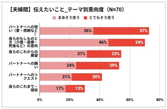 - <夫婦間>で伝えたいこと第1位は「愛・感謝」で73%。2位は僅差で「もしものとき(介護・医療・死後など)の意向」で70%