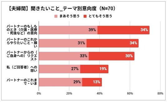 - <夫婦間>で聞きたいこと第1位は「もしものとき(介護・医療・死後など)の意向」で73%、2位は「これからやりたいこと・願い」で65%。<親から子>と同じく、”これからのこと”を聞きたいという傾向が表れた