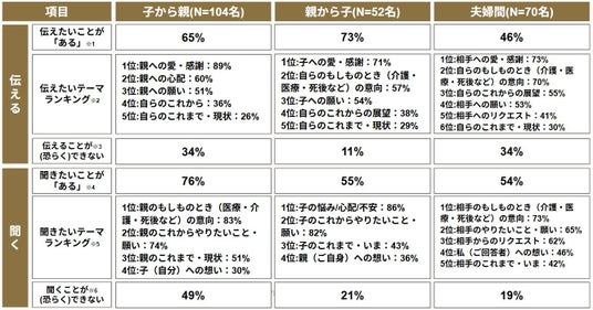 加えて、本調査では「家族で話したいこと、聞きたいことランキング」を公表。親から子・子から親・夫婦間のすべてで、伝えたいことの第1位は「愛・感謝」であることなどが分かりました。