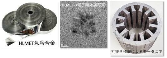 これまで高Bs低鉄損材は高性能モータ向けコア材として多くの企業が実用化に向けて取り組んできましたが、従来の高Bs低鉄損材は何れも鉄基合金の金属組織を数10nm(ナノメートル:1nmは1mmの1/1,000,000)の微細結晶組織にすることで、高Bs低鉄損性能を得ていました。ただしナノ結晶化することで性能を確保できるものの、素材が脆くなるためにモータコア化が難しく、実用化に至っていませんでした。