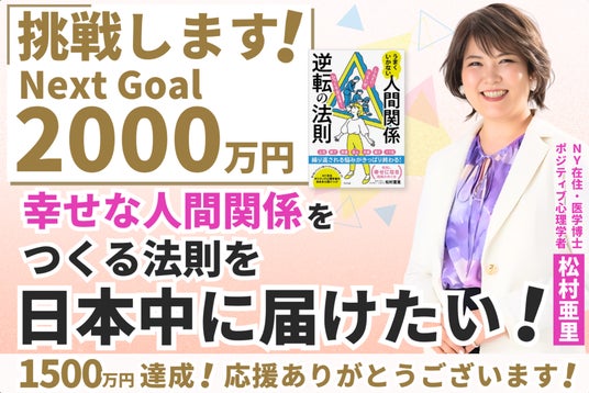 医学博士・臨床心理士・ポジティブ心理学者の松村亜里が実施している、クラウドファンディング「どろどろの人間関係はもう終わり! 幸せな人間関係をつくる法則を日本中に届けたい!」が目標(ネクストゴール)の1500万円を達成しました。7月18日の最終日に向けて、最終ゴール2000万円を目指します。