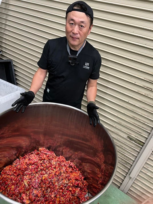 地元・山形のニュース番組からも取材。猛暑による歴史的な凶作で自身も昨年の1/3の収穫量に。売り物にならない大量の完熟サクランボを買い取り、山形産佐藤錦100%の高級ビールにアップサイクルする取り組み