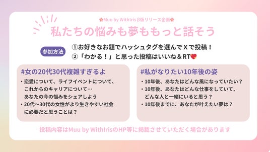 またより多くの方に、20代~30代の女性が直面する「これからの人生どうする?」問題について一緒に考えてもらうべく、Muu by WithIrisのβ版リリース記念として、20代~30代女性のリアルな気持ちを可視化するX(旧Twitter)キャンペーンを実施します。
