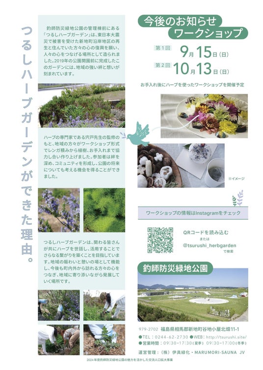 「つるしハーブガーデン」は東日本大震災によって失われたコミュニティの再形成を願い、復興ボランティアの皆さんのご協力のもと、福島県新地町の海沿いの公園「釣師防災緑地公園」に作られました。