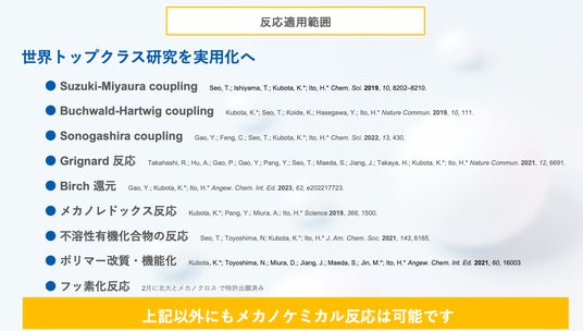また、有機合成反応の適応性の広さも特徴的で、北海道大学工学研究院の伊藤研(伊藤卓越教授は、メカノクロスの取締役)では、多くの化学反応を実証してきました。