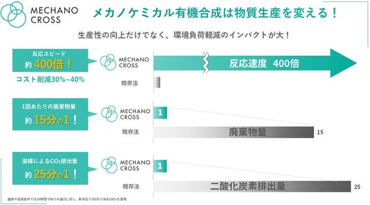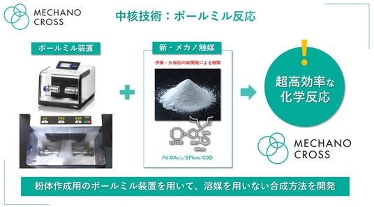 メカノクロスは現在、本技術を社会実装する目的で立ち上げ、2026年以降の本格的な市場参入に向け、国内外の製薬、化学メーカーなどと協力してメカノケミカル有機合成プロセスの導入実証を進めているところです。溶媒を極少量まで減らせ、反応性が高いことから、脱炭素対策向けや大幅なコスト削減向けを始めとして既存のプロセスよりも優位なデータを出せており、化学合成を用いるメーカーなどから積極的な引き合いを頂いております。