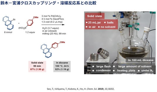 メカノケミカル有機合成は、医薬品の合成や化学材料の合成に用いられるカップリング反応において、溶液反応と比較して、生産性の高さや二酸化炭素排出削減が顕著であり、これまで学術的に多くの関心が寄せられています。