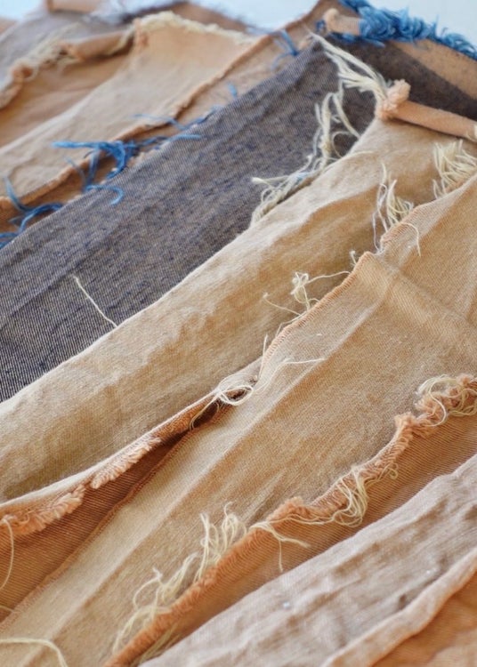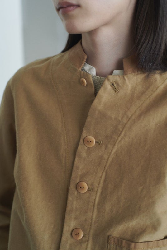播州織の産地にある桑村繊維株式会社と何度も話し合い、試作した生地は24通り。その中から着心地やシルエット、洗い上がりの表情などを吟味。タテ糸とヨコ糸の色を変え、色に深みも持たせています。また、ラフィの表情がより際立つ「バック」裏面を使い、襟やベルトなどデザインのポイントに活用しています。