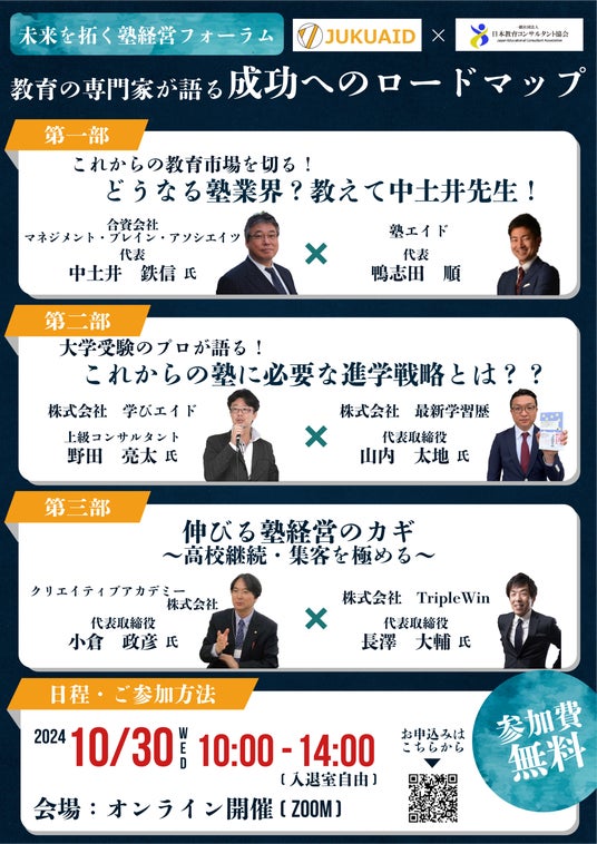 「塾の成功と学生の成長を両立させ、より広く価値を提供したい」という目的・志のもとに主体的に集まり、相互に協力して地域教育に貢献するための塾・スクール経営の組織である塾エイド(運営法人:株式会社インサイト・ジャパン、代表取締役社長:鴨志田順)は、「塾経営フォーラム」をオンラインにて開催いたします。