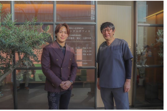 (左/弊社代表 植倉 弘智、右/ノブデンタルクリニック 北原 信也理事長)