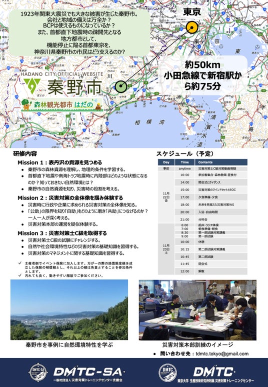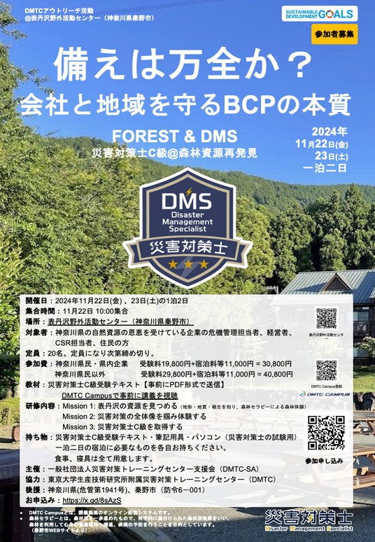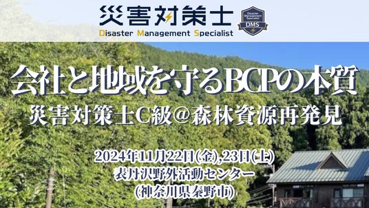 一般社団法人 災害対策トレーニングセンター支援会( 以下、DMTC-SA )が主催する能力認定制度「災害対策士」のC級試験を、神奈川県秦野市の森林で合宿をしながら受験できる一泊二日の防災体験プログラム『会社と地域を守るBCPの本質 -災害対策士C級試験@森林資源再開発- 』を、2024年11月22、23日に開催いたします。現在、参加者募集中です。