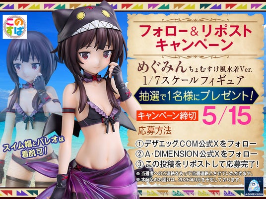 また、予約開始を記念して、X(旧 Twitter)のフォロー&リポストキャンペーンを実施いたします。 ライセンスエージェントの運営するデザエッグ.COM の公式 X アカウント(https://x.com/dezaegg) A・DIMENSION の公式 X アカウント(https://x.com/adimension_toy)のフォローと、指定の投稿を リポストする事で、抽選で 1 名様に、同フィギュアをプレゼントいたします。 可愛いちょむすけ風水着姿のめぐみんをお手元に。