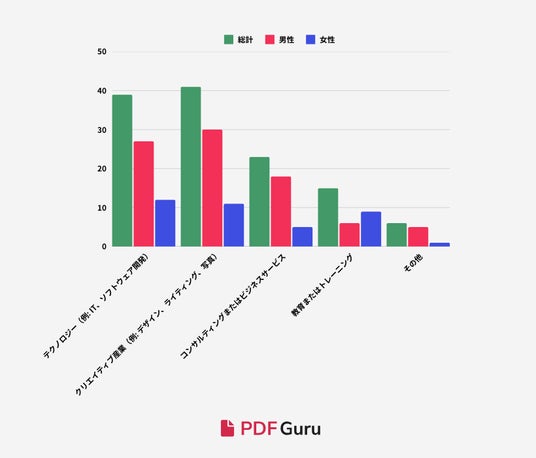 業界別の傾向として、女性は教育分野で、男性はクリエイティブ業界で活動する割合が多いことが確認されました。一方で、テクノロジー分野においては男女の割合が比較的均衡している点が特徴的です。