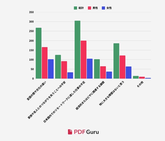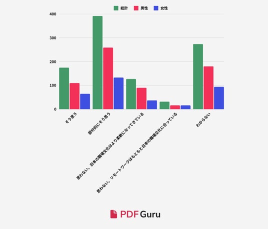 多くの回答者が 日本の伝統的な職場文化がリモートワークの普及を妨げる要因になっていると認識しており、特に管理職のリモートワークに対する理解度の低さが課題として挙げられました。ただし、一部の回答者は徐々に文化が変化しつつあることも認めています。