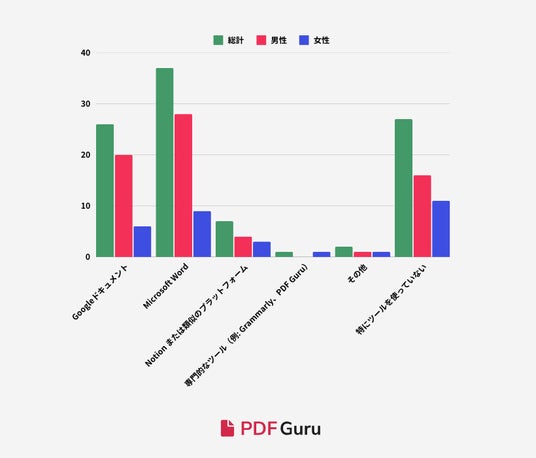 調査結果から、Microsoft Word と Google ドキュメントが主流である一方、特化したデジタルツールの普及率はまだ低いことがわかります。また、男性は 女性よりもMicrosoft WordやGoogle ドキュメントの使用度が高い傾向が見られました。