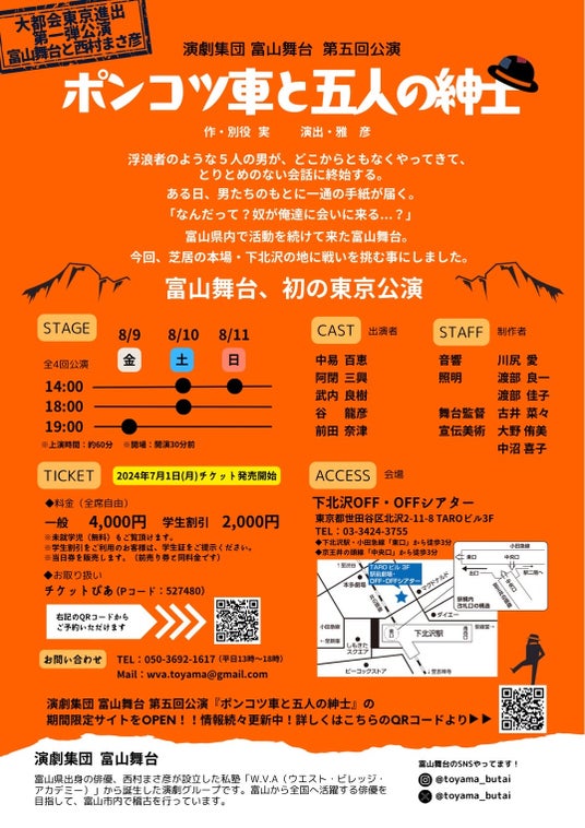 演劇集団 富山舞台 第五回公演『ポンコツ車と五人の紳士』を8月9日(金)~11日(日)まで、東京の下北沢OFF・OFFシアターで上演します。