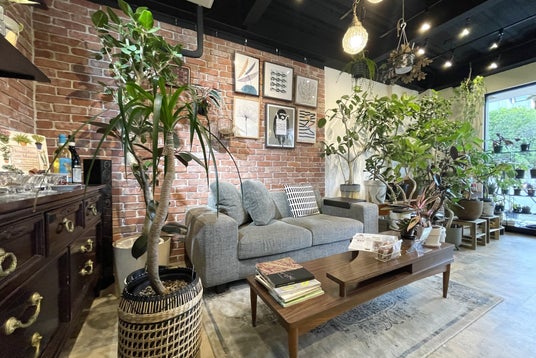 カフェ利用ができるリビングコーナー。自宅で植物をディスプレイする際の参考にも。