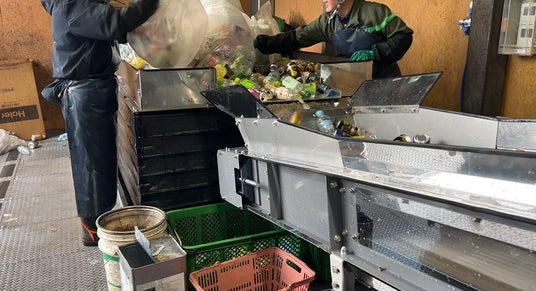 飲料容器の多くは袋詰めで回収されますが、回収袋の中には瓶の破片や異物が混入していることもあり、作業者の手選別作業には危険が伴います。また、人力での選別作業には多くの人手が必要です。