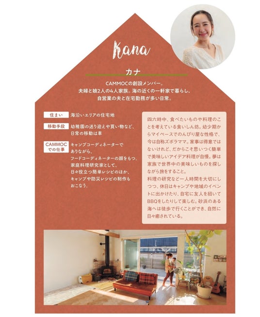 CAMMOCの創設メンバー。夫婦と娘2人の4人家族。海の近くの一軒家で暮らし、自営業の夫と在宅勤務が多い日常。