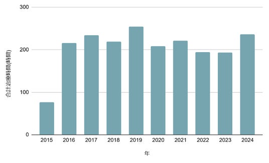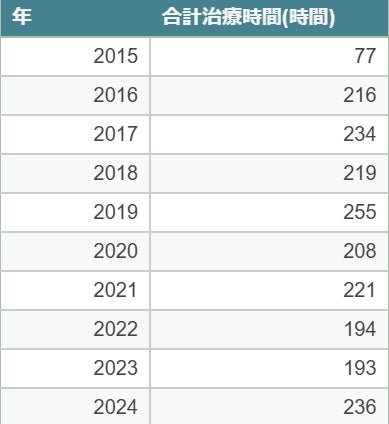 下記は2015年から2024年までの各年におけるマイクロスコープ下での根管治療の合計治療時間(単位:時間)をまとめたものです。