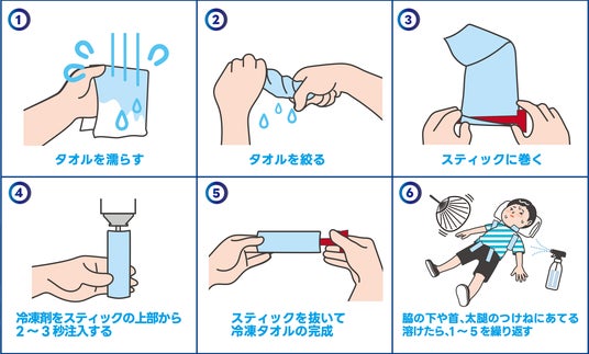 水で濡らしたタオルを、専用スティックに巻き付け、冷却剤をスティックに2~3秒注入するだけで冷凍庫で凍らせたタオルのようになります。