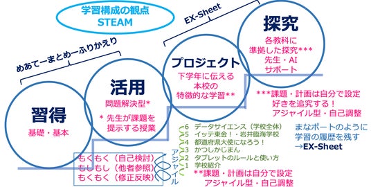 本校ではこれまで「STEAM教育」、児童が主体となって学習計画を立て学習に取り組んで振り返り修正していく「アジャイル教育」について研究してきました。そして、今年度はこれまでを統合して習得から探究へつなぐ「習得-活用-プロジェクト-探究」のカリキュラムの開発について研究しています。詳細は特設サイトで写真とともに事例も紹介しています。