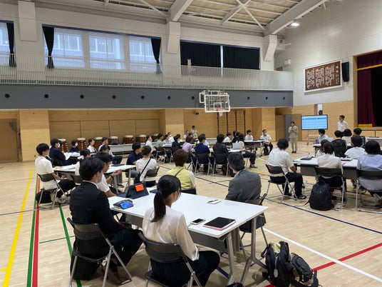 授業公開の後は体育館で研究協議会を行います。児童主体の学びを目指している先生方が参加してくださる本研究協議会を、一斉教授型で行うのはもったいないと考えました。