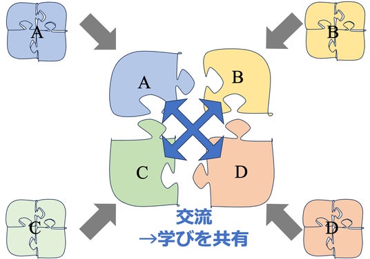 そこで本研究協議会では、ジグソー法を活用して【習得】【活用】【プロジェクト】【探究】のそれぞれの学びを手分けして主体的に学び、それらを共有するために教え合い・学び合うことを経験してもらいたいと思います。