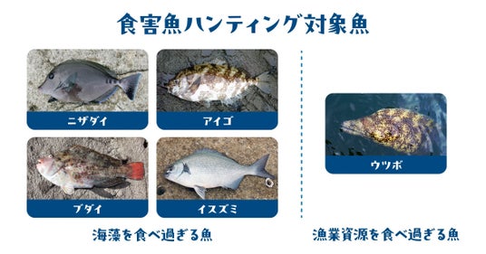 「食害魚」とは何かを食べすぎてしまい、漁業活動に害を与えてしまう魚のことを指します。今回の企画では、海藻を食べ過ぎてしまう食害魚と、漁業資源を食べ過ぎる食害魚を対象とします。