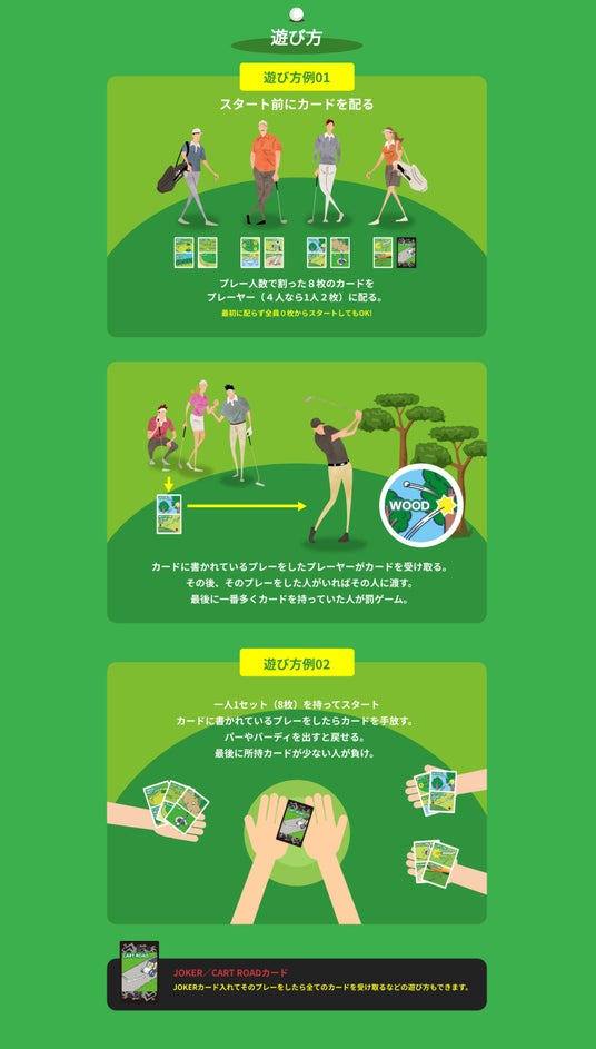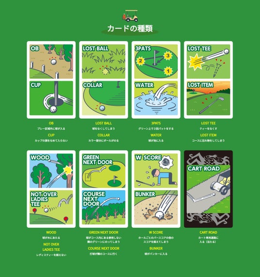 カードに描かれたプレー内容、条件を満たしたプレイヤーにカードを渡していきます。その後、同じことをしたプレイヤーにカードは移動。最後の時点で、多くのカードを持っていたプレイヤーがペナルティを受けるというシンプルなルールです。一方で、特別賞などポジティブな使い方も可能です。また、黒いカード「CART ROAD」(打球がカート道で跳ねた、止まった等)は「Joker」扱いすることで、ゲームがひっくり返るような展開も実現できます。