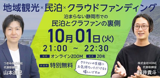 つきみ株式会社(本社:静岡県静岡市、代表取締役:山本達巳)とAstlocal株式会社(本社:静岡県静岡市、代表取締役:桜井貴斗)は『地域観光×民泊×クラウドファンディング』をテーマとした共催セミナーを2024年10月1日(火)に開催します。