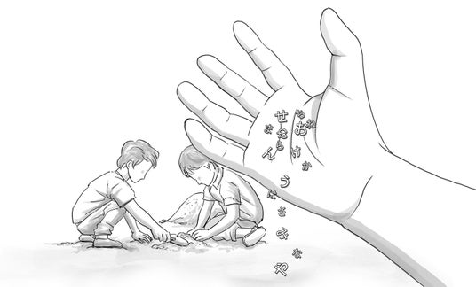 五十音が書かれた葉を自由に並べることで、さまざまな言葉ができあがる。