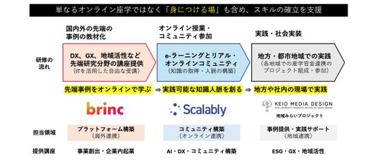 香港を拠点に世界最大級のセクター特化型アクセラレーター・プログラムをアジア全域で展開し250社以上のスタートアップに投資を行っている世界的アクセラレーター「Brinc」の日本法人であるBrinc Japan株式会社(本社:東京都港区、代表取締役:岡澤 恭弥、以下、Brinc)は、オリジナルの起業家向け教育カリキュラム「Brinc Academy」を開発した知見を活かし、コミュニティを軸にした新たなマーケティングソリューションを開発するScalably株式会社(本社:東京都港区、代表取締役:山本 純矢、以下、Scalably)と、産学官金連携で地方創生プロジェクトに取り組む慶應義塾大学大学院メディアデザイン研究科(所在地:横浜市港北区、研究科委員長:稲蔭正彦、以下、KMD)と共同で、事業成長につながる人材の育成を目的にした企業向けの「社会課題解決リスキリング特別講座」の提供を開始します。企業の事業創出やESG対応、AIの事業利活用など、企業活動の市場変化への対応をeラーニングとリアルプロジェクトを通じた社会実装を通じて支援します。