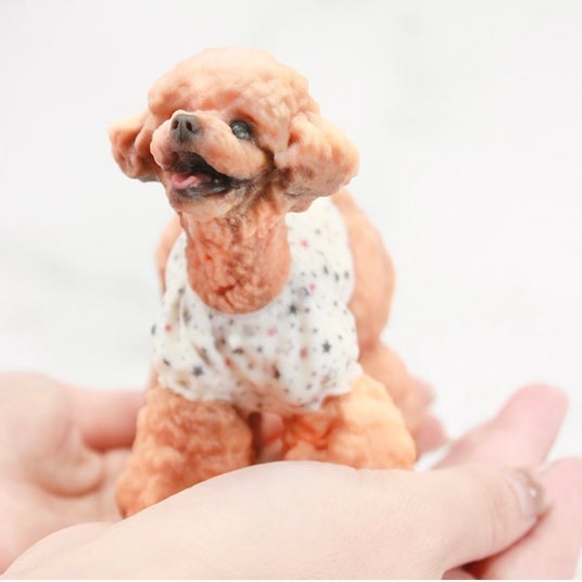 撮影した64枚の写真から独自の技術で精巧な3Dデータを作成し、最新フルカラー3Dプリンターで造形します。フルカラーのインクで、60μmという単位で積層造形できるため、羊毛フェルトやぬいぐるみでは表現できない、お洋服の柄やロゴ・しわ・首周りのお肉・体の毛の模様までそっくりそのままに再現いたします。