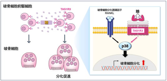 本研究により、TAS1R3は破骨細胞前駆細胞(※6)に存在し、破骨細胞の分化とともにその量が増加することがわかりました。また、TAS1R3が存在しない破骨細胞前駆細胞では、破骨細胞への分化や成熟の能力が低下する一方で、TAS1R3 を多く発現する破骨細胞では、その能力が顕著に向上しました。通常、口腔内ではTAS1R3 はTAS1R1とヘテロダイマーを形成してうま味を、TAS1R2とヘテロダイマーを形成して甘味を受容します。しかし、破骨細胞前駆細胞や破骨細胞では、TAS1R3がホモダイマーを形成して機能している可能性が高いことが、結合実験や立体構造解析によって明らかになりました。さらに、TAS1R3 に対する糖の刺激は、p38という破骨細胞の分化に必要な分子を活性化することが確認されました。p38の働きを妨げる薬剤で処理すると、TAS1R3が破骨細胞の分化を促進する現象も抑制されました。