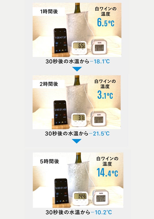 検証実験の画像のとおり、1時間、2時間と経ってさらに温度は下がり、なんと5時間後も10℃マイナスの温度を保ち続ける優れものです。