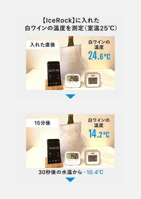 【IceRock】は、冷凍庫に入れてわずか2時間ほどで凍結。凍った【IceRock】の中にお好みのボトルを入れて約15分待てば、飲み物の温度は入れる前より10℃以上下がります。