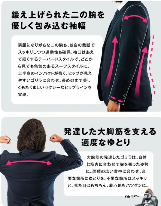 【募集期間】2024年8月21日(水)16:00~9月20日(金)/クラウドファンディングサイト「Makuake」にて募集。既存のスーツ市場では対応しきれない体型を持つ男性のニーズに応える「ゴリラスーツ」。市場ニーズの隙間と創業95年の老舗企業の技術を掛け合わせることで誕生しました。