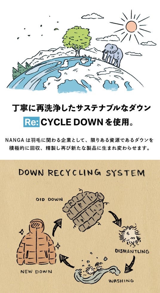 「ダウンと言えばハッピージャケット」といわれるほど、着回し力抜群で大人気のデザインをNANGAで初めて採用。アウトドアシーンだけでなく通勤や日常使いのしやすさに拘り、どんなシーンでも使えるダウンに仕上げました。高い技術力とダウンへの拘りを持つNANGAとの共同開発により、デザインだけでなく防寒・撥水・軽量に優れたダウンが誕生しました。
