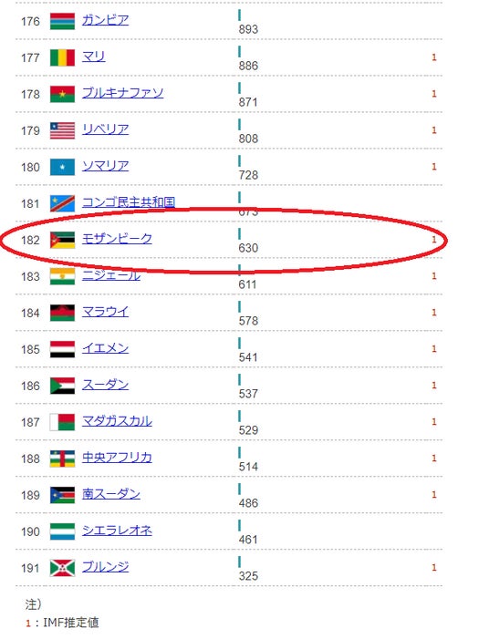 2023年の一人当たり名目GDPの順位です(リンク)。経済的な豊かさの指標としてよく使用されます。モザンビークは191カ国中182位です。上下にある国のほとんどがアフリカの国です。