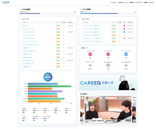 質問に答えてクエストを進んでいくとあなただけのキャリアデータを生成できる「キャリアの壁打ちサービス」です。受検後、定量的なスコアとアドバイスが手に入ります。クエストの内容はディプコア社が数千人の転職検討者さま、数百社の企業さまと対話してきた情報をもとにベースを作成。加えて、業界のトッププレイヤーに対して、活躍している営業の共通点や選考プロセスで見ているポイントなどについて定期的にヒアリングを行っており、スコア配分や質問を随時更新。またCAREEQ利用者は、ユーザー限定のインタビュー記事を読むことができ、セールスの業界トッププレイヤーがどう成長してきたか?何を大事にしているか?といった内容からも、成長のヒントが見つかります。転職時だけではなく、いつでもキャリアをサポートできるサービスを目指しています。