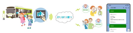 今回の実証実験では希望者を募り、希望する児童ひとり一人にICカードを配布、保護者のスマートフォンでLINE公式アカウント「のりおり便り」を友だち追加およびICカードを登録していただきます。児童がスクールバス乗車/降車時にICカードを読取機にかざすと、保護者は乗車/降車した時刻や停留所などの情報をPush通知で受け取ることができます。
