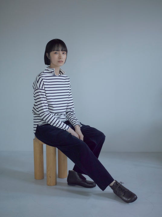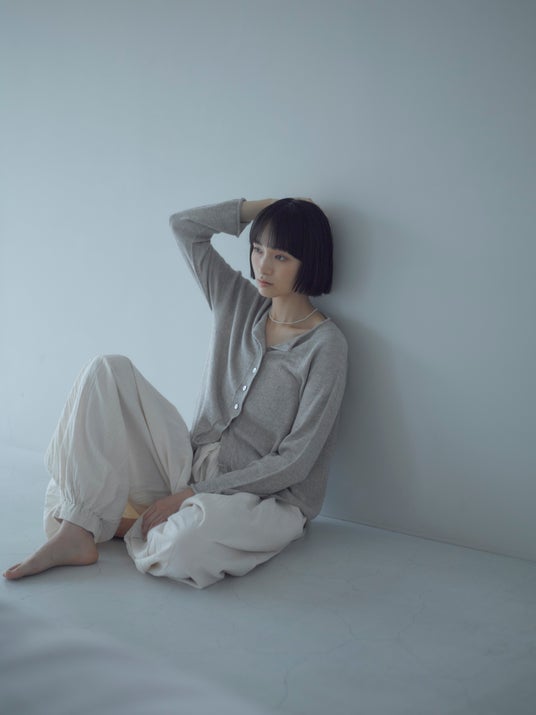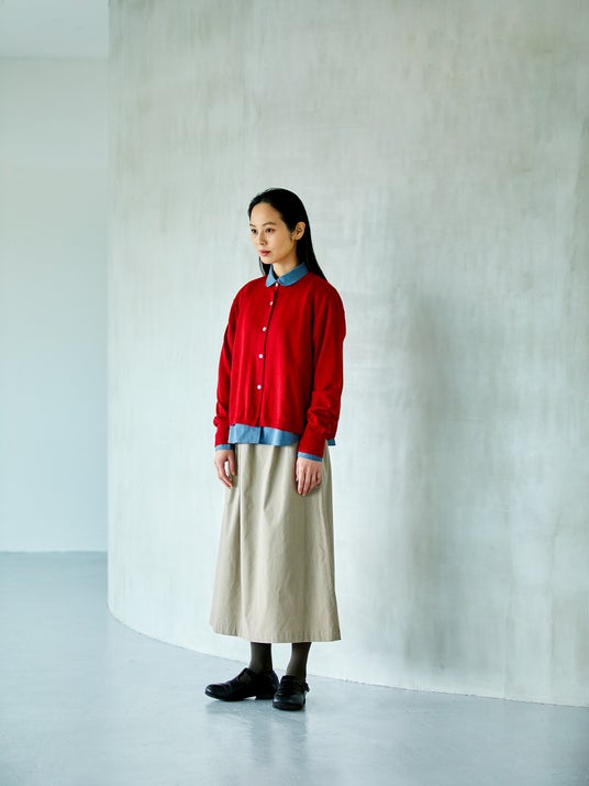 カーディガン:ウール×レーヨンクレープカーディガン ¥17,800 ブラウス:タマムシシャンブレーシャツ ¥16,500 スカート:エアーコールギャザースカート ¥17,600円 photo:Eri Kawamura
