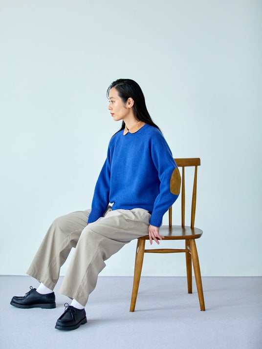 ブラウス:タマムシシャンブレーシャツ ¥16,500 セーター:エルボーパッチセータークルー ¥20,900