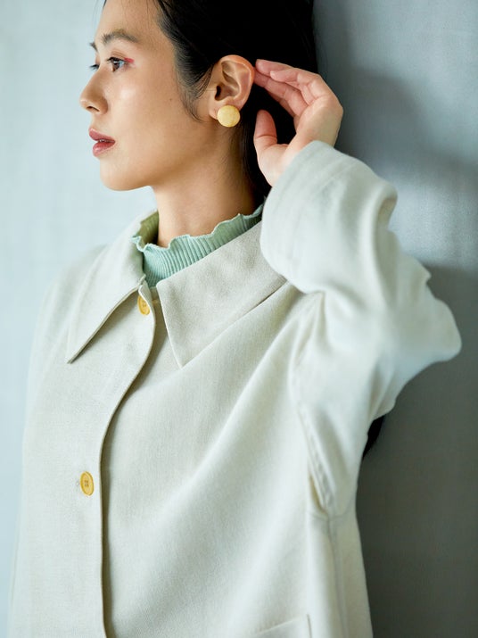 大きな襟が印象的なジャケットに使用したのは、綿麻の混紡糸と毛の糸で織りあげた生地。