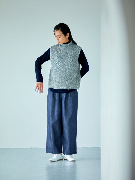 ベスト:ファンシーツイードボトルネックベスト ¥18,700 カットソー:コットンフライスハイネックプルオーバー ¥9,350円 パンツ:FADELESS デニムパンツ ¥22,000円 photo:Eri Kawamura