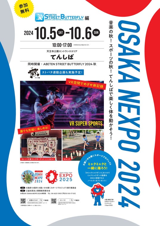 6月のうめきた編から始まった 、誰もが楽しめる体験型のスポーツイベント「おおさかネクスポ2024」の第4弾は、てんしば(天王寺公園エントランスエリア)にて「ABETEN STREET BUTTERFLY 2024(秋)」と同時開催することが決定いたしました!