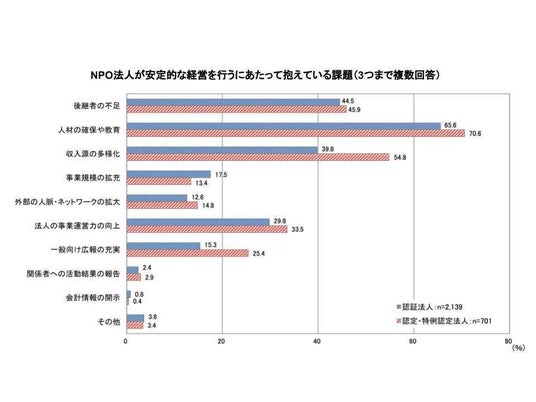 一方で、2023年度に全国の特定非営利活動法人(NPO法人)に内閣府が行ったアンケートでは、「現在抱える課題」についての質問に対し、2840の回答のうち最も多かったのが「人材の確保や教育」でした(66.9%)