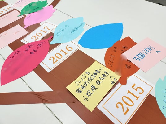 創業時からの団体の歴史を木に見立てて並べていき、そこにチームメンバーの個々の歴史も入れ込み、チーム全員の歩みを可視化していく。
