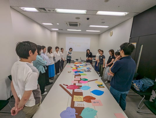 Tree of History(ツリーオブヒストリー)では、まずチームの構造を知り、多様なメンバーの違いをチームの力にする手法を学んだ後、名称の通り、団体設立からの歩みを、一本の木に見立てて可視化します。新しいスタッフは、創業期のスタッフと比較すると、組織の歴史を深く知ることなく業務を遂行せざるを得ないこともあります。まずはチーム全員で、創業期の想いやその後の実績を確認します。そこから改めて「自分たちが何を大切にするのか」という共通認識をつくり上げ、変化に応じた次の一歩を描いていくプログラムです。